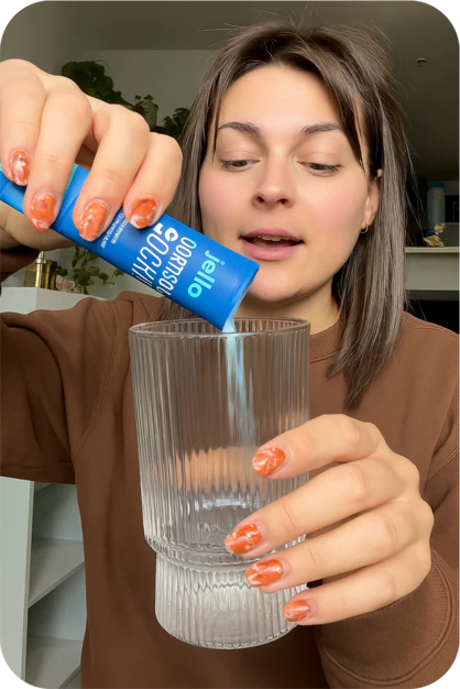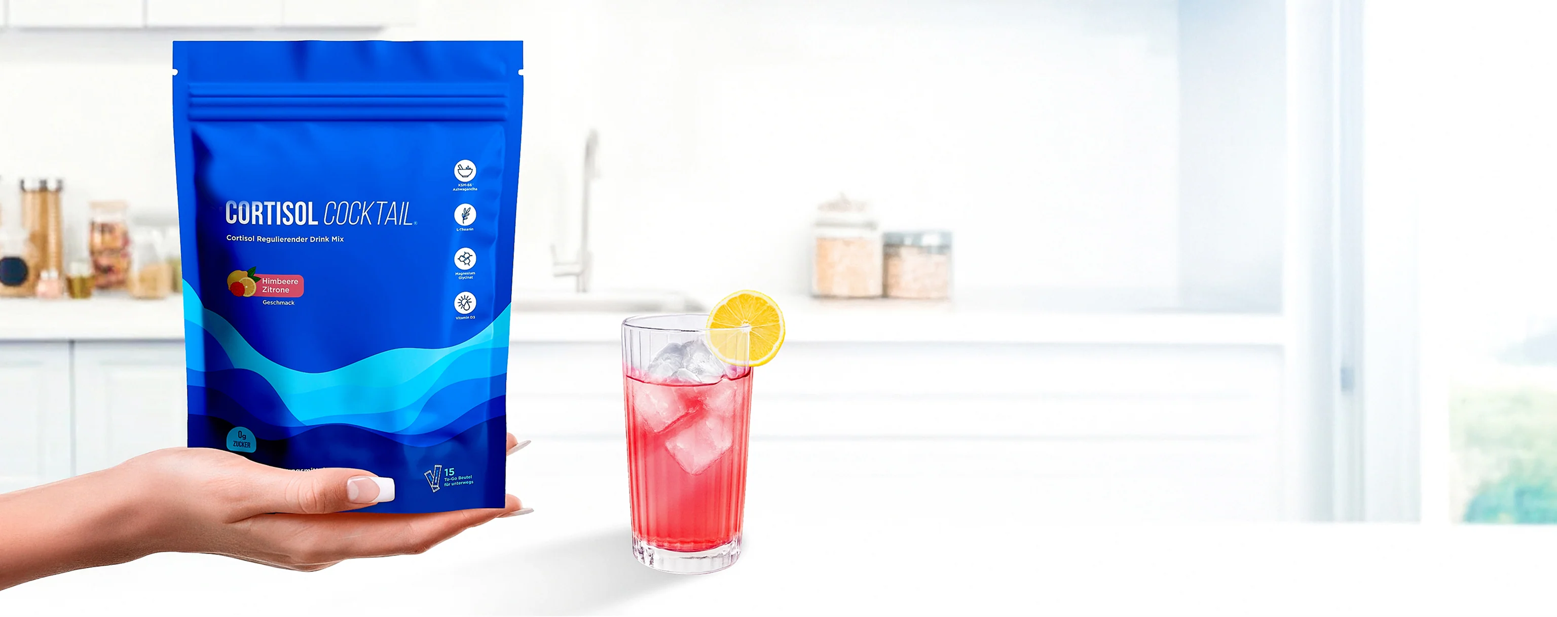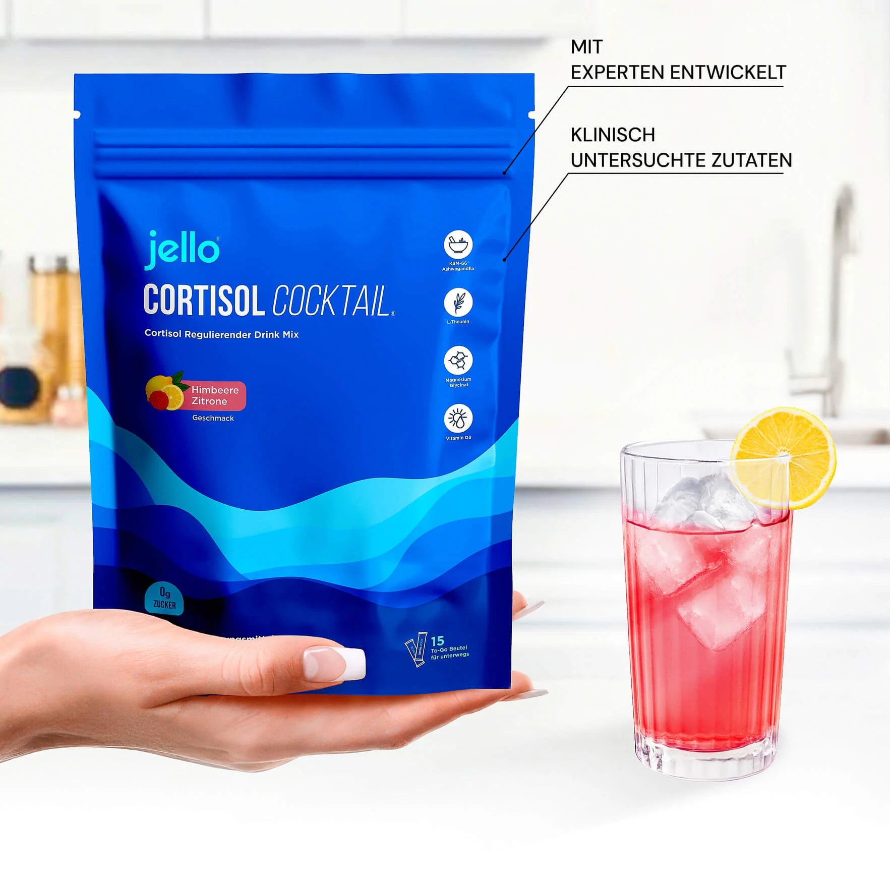 Jede Jello-Box enthält 15 praktische Einzelportionen mit Ashwagandha KSM-66 (300mg), Magnesiumglycinat (100mg), L-Theanin (400mg) und Vitamin D3 (1000 IU), plus natürliche Aromen für den perfekten Geschmack. Einfach einen Stick in 250ml Wasser einrühren — fertig ist dein abendlicher Routine-Drink.